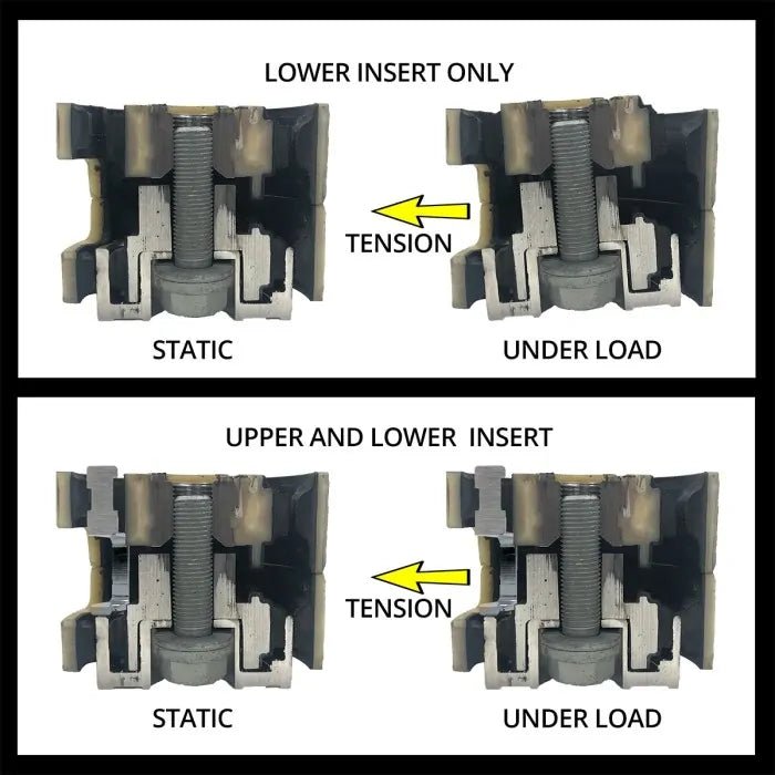 This testing revealed the cause of the bending, and our engineering team developed the 034Motorsport Billet Upper Dogbone Mount Insert to solve the issue. This insert slips into the front void of the upper dogbone mount puck, limiting the forward motion of the upper puck to match the limited forward motion of the lower puck with the lower insert installed. The result is an upper and lower insert package that eliminates the rotation inside the puck assembly during extreme drivetrain shocks, and keeps the forces acting on the dogbone arm in the direction the arm was designed for. Subsequent testing showed no signs of bending or stress in the dogbone mount arm with both the upper and lower dogbone mount inserts installed. Watch the demonstration video below to see how the dogbone mount pucks move with just the lower insert, and the upper and lower insert combined.