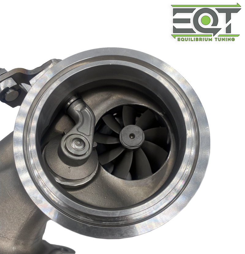 The Compressor Cover on the Typhoon is equipped with a 3" inlet and 1.5" outlet to allow maximum flow through the ported shroud to the 2618 billet compressor wheel which generates a ton of airflow allowing power levels to be pushed upwards of 660whp! It's also provisioned for an OE Diverter valve and mounting bosses for the charge actuator for easy installation of your original hardware, or a new EQT actuator which can be pre-installed and calibrated at EQT before shipment.