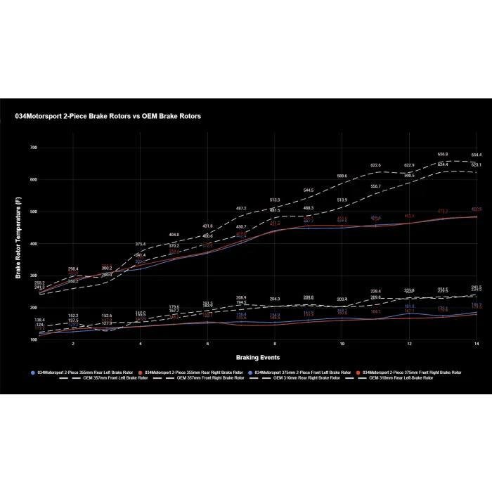 After installing the 034Motorsport Upgraded 2-Piece Brake Rotors, both left & right rotors increase in heat more evenly throughout all 14 consecutive braking events. By increasing thermal mass and improving the cooling, the 034Motorsport 2-Piece Brake Rotors stay nearly 140°f cooler than the the factory rotors in similar testing conditions with the same brake pads.