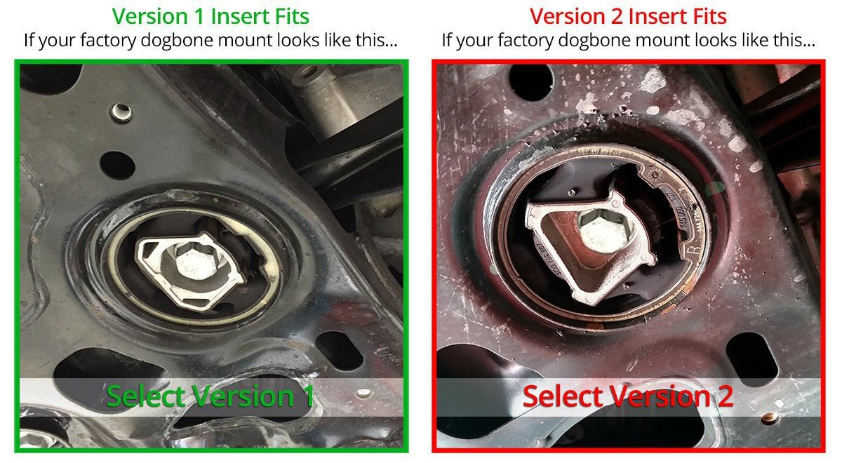 Please Note: Some Mk7 GTI & Golf R models are equipped with a different factory dogbone mount. To ensure fitment on your vehicle, please visually verify the mount you have using this guide, then select the Version 1 or Version 2 insert before adding the item to your cart.